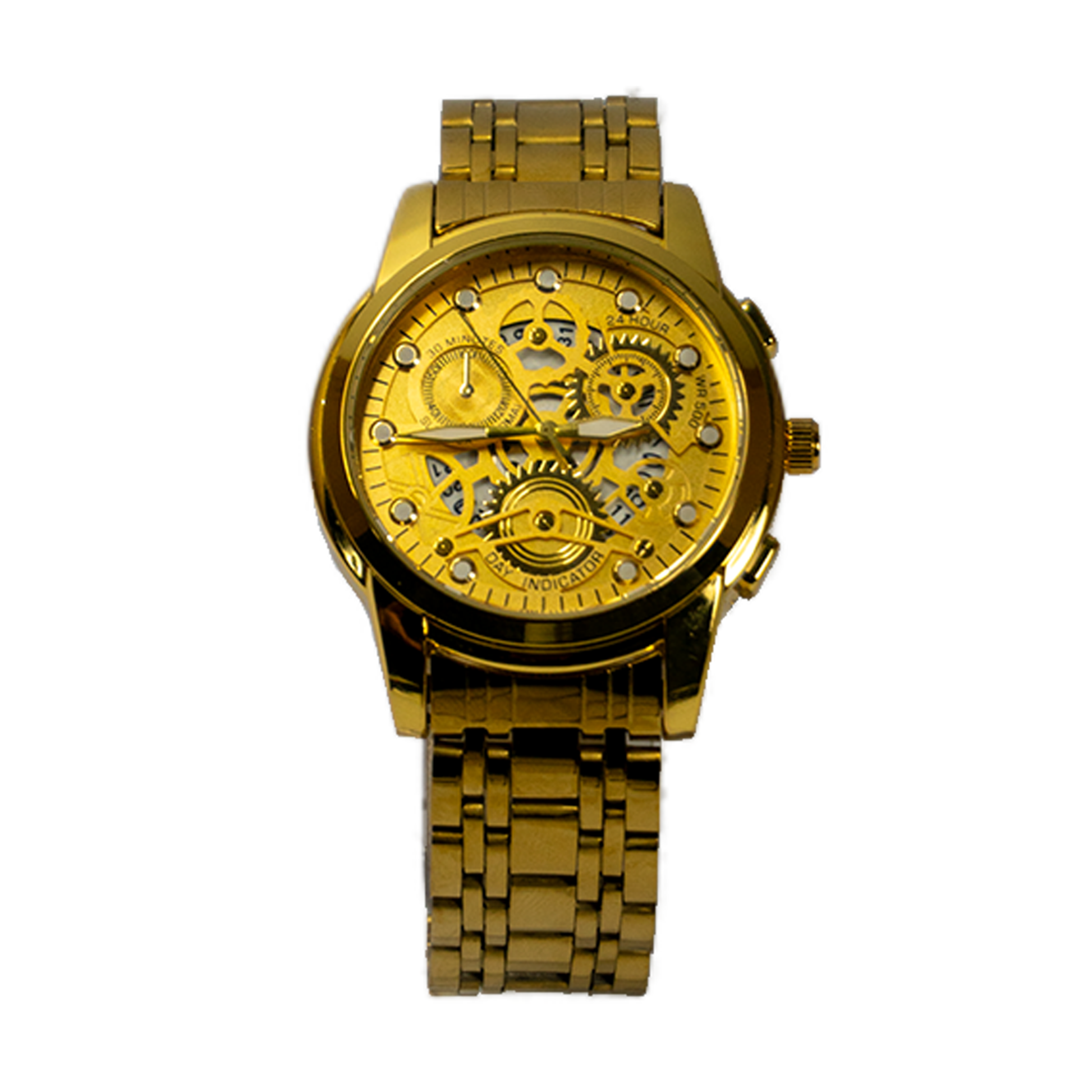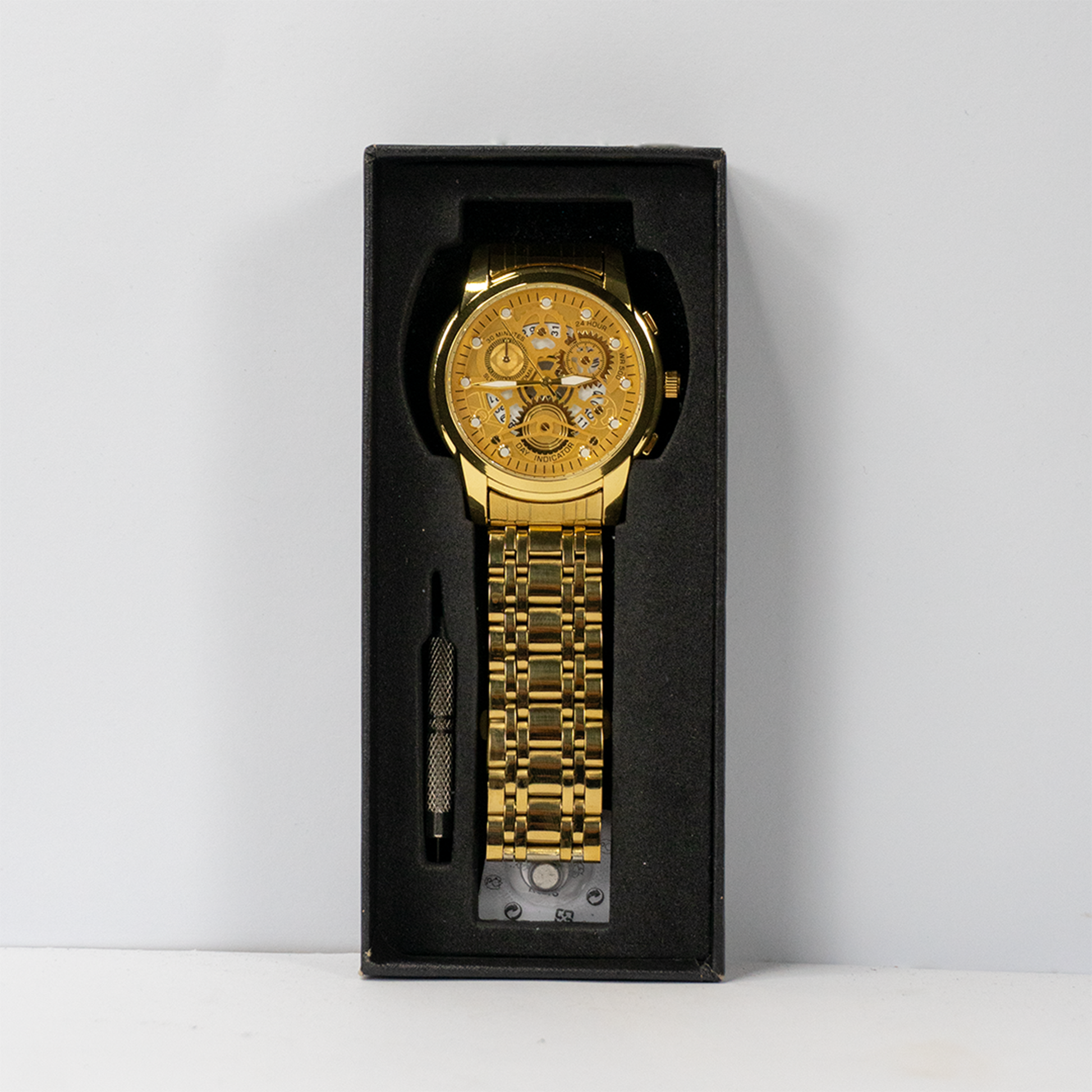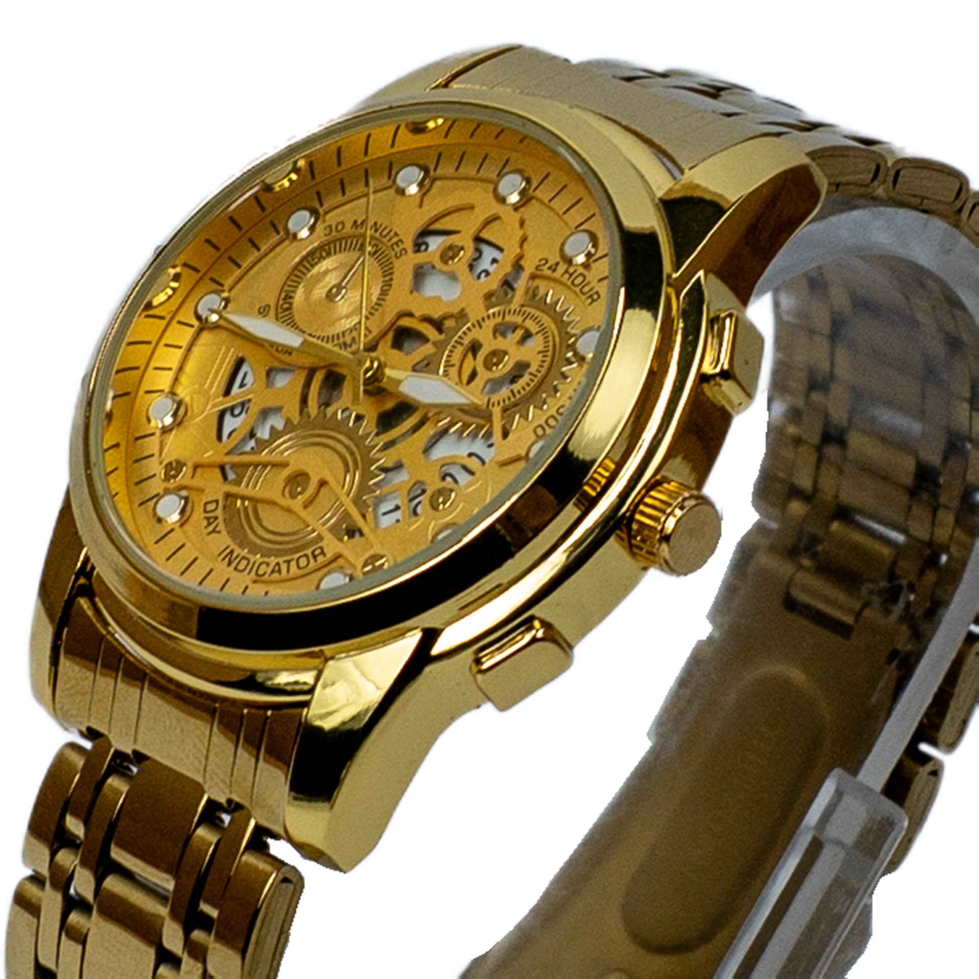 The Fngeen is a luxurious and eye-catching timepiece that radiates elegance and prestige. Crafted with a gold-tone stainless steel case and matching bracelet, it delivers a bold, sophisticated look suitable for high-profile occasions and everyday luxury wear. The black dial is adorned with diamond hour markers, adding a touch of brilliance and refinement. The watch features gold-tone hands, including the signature Rolex sweeping second hand, and a date display at the 3 o’clock position, enhanced by the iconic Cyclops magnifier for easy reading.